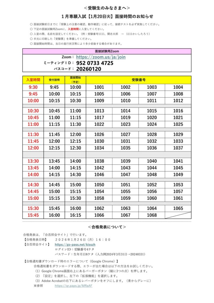※面接時間およびzoom面接室への入室時間が分からない場合は、本校にお電話でお問い合わせください。