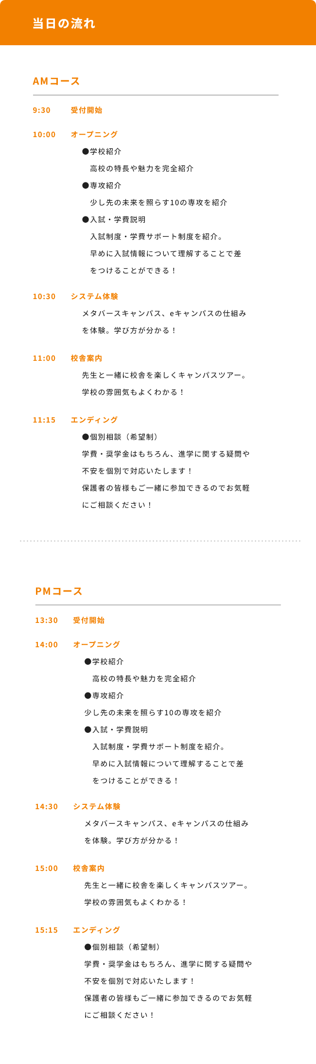 完全予約制の個別形式で月~金の10時~17時の間なら、ご都合のよい時間を選んで来校かオンラインで相談できます。保護者の方同伴や、保護者の方のみのご参加も大歓迎です。いま不安に思っていること、気になっていることなど、「いま知りたいこと」に合わせて行う個別相談になります。