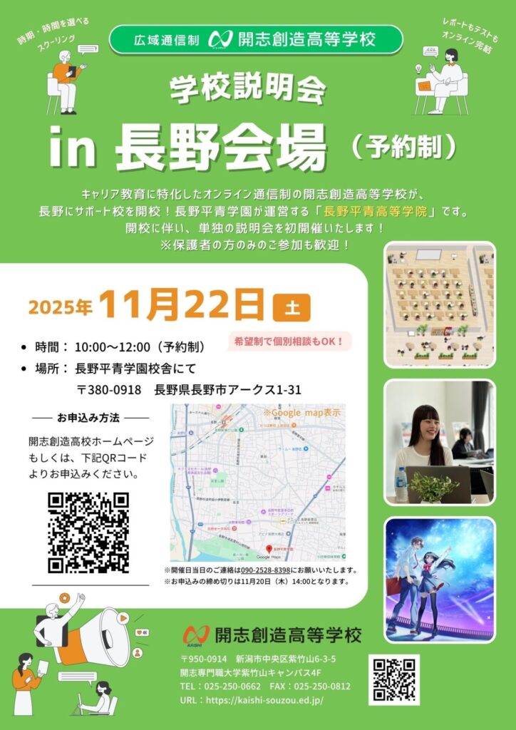 開志創造高校では、11月22日(土)10時より長野で学校説明会を開催します。場所はサポート校の長野平青高等学院。開志創造高校の説明と、サポート校の仕組みをしっかり聞くことができます。